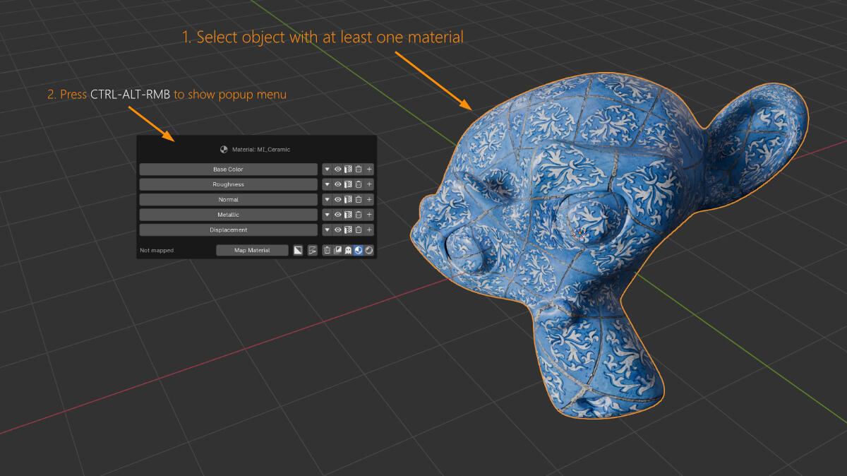 3. Use the popup to preview, tweak, and manage channels, textures, and mapping.The popup appears in the 3D Viewport and adapts to the active object/material.
