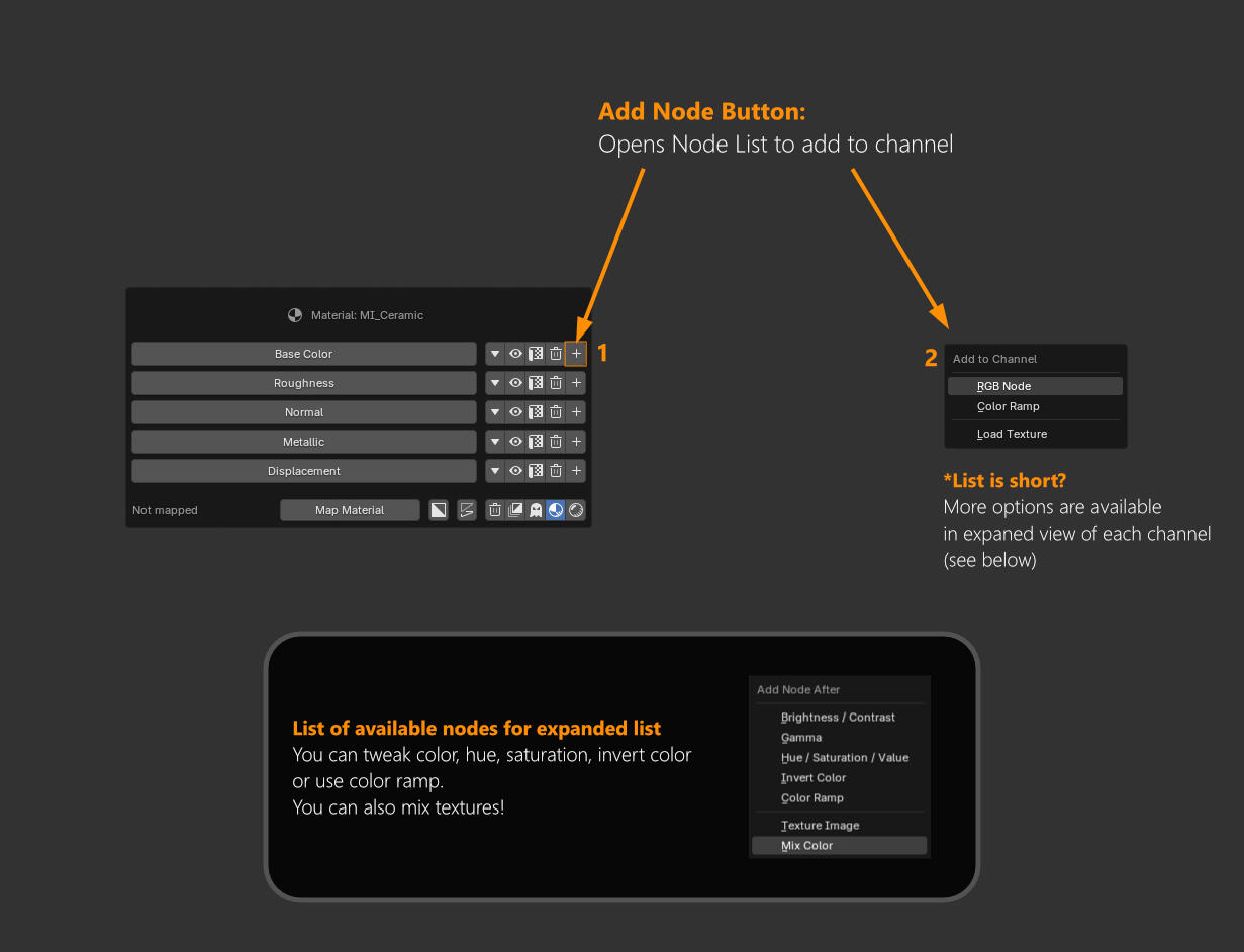 Add Node button opens menu with items:Add RGB Node: Insert an RGB color source into the channel chain. Available only for Base Color and Emission Color channels.Add Color Ramp: Insert a Color Ramp for quick remapping/contrast. Node is inserted at the end of a chain of nodes for the selected channel.Load texture: opens texture selector window for adding detail textures for selected channel.