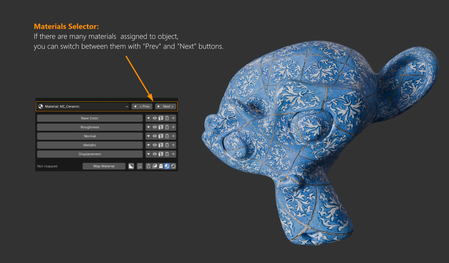Materials Selector: If there are many materials assigned to object, you can switch between them with "Prev" and "Next" buttons.