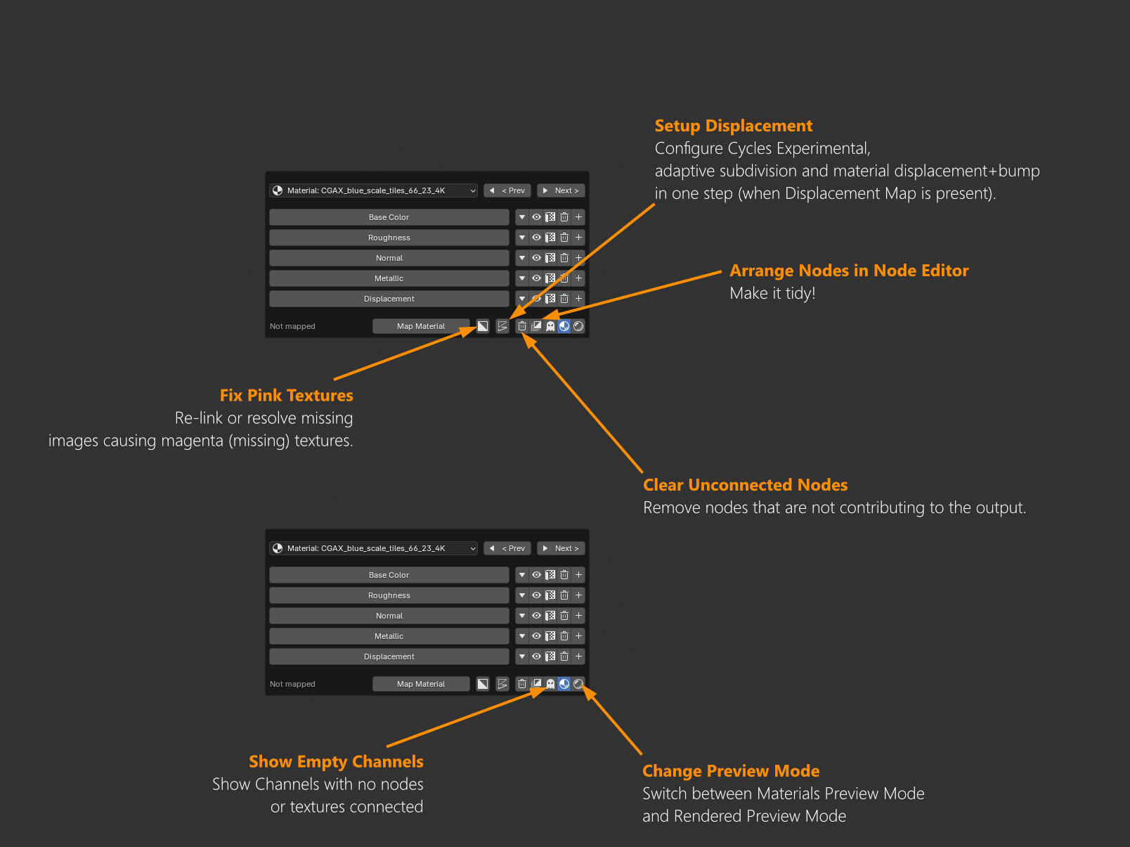 Mat Inspector is a Blender add-on that helps you inspect and manipulate material channels quickly from a compact popup in the 3D Viewport. It streamlines actions like previewing individual channels (Base Color, Roughness, Normal, Displacement, etc.), loading and browsing textures, organizing mapping nodes (global or channel-specific), and managing node graphs.
