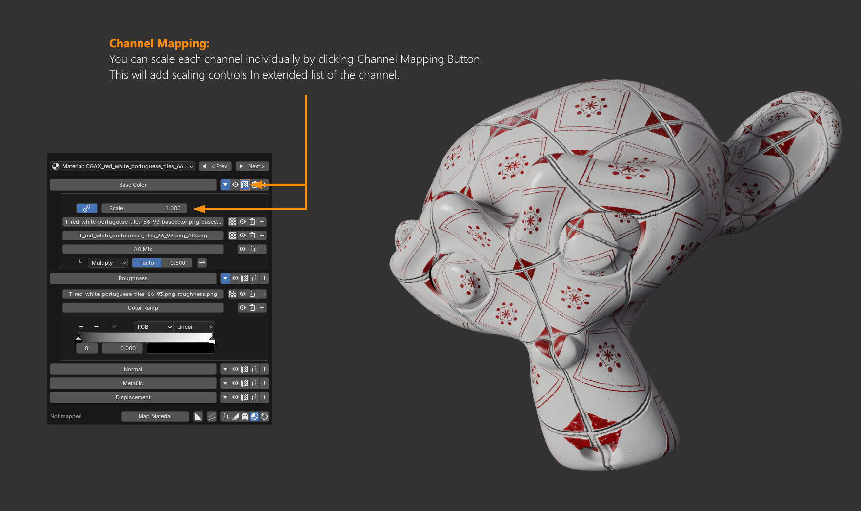 Mat Inspector Pro supports ALL Principled BSDF channels:Base Color, Roughness, Normal, Metallic, Transmission Weight, Emission Strength, Emission Color, Subsurface Weight, Alpha, Specular IOR, Coat Weight, Coat Roughness, Coat Tint, Sheen Weight, Sheen Roughness, Thin Film Thickness, DisplacementPreview Channel: Click each channel name to show a temporary view of a specific channel’s effect. Toggle again to restore the original setup.Toggle Channel Mute: Mute/unmute all nodes that contribute to the chosen channel.Toggle Channel Mapping: Create/remove a channel-specific Mapping node for independent UV scaling from the global mapping.Remove Channel Connection: Disconnect the channel’s current link from the Principled input (non-destructive to other links).