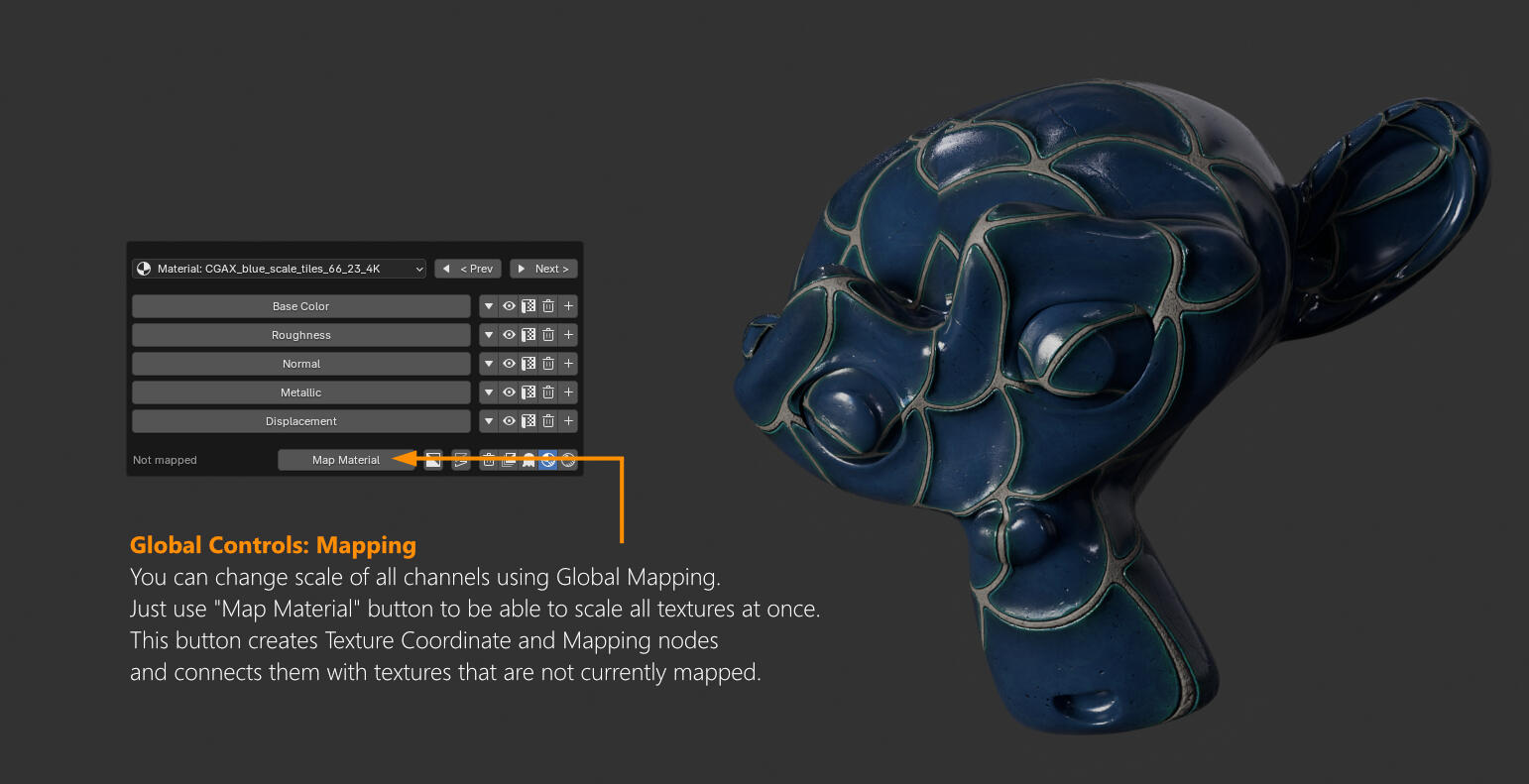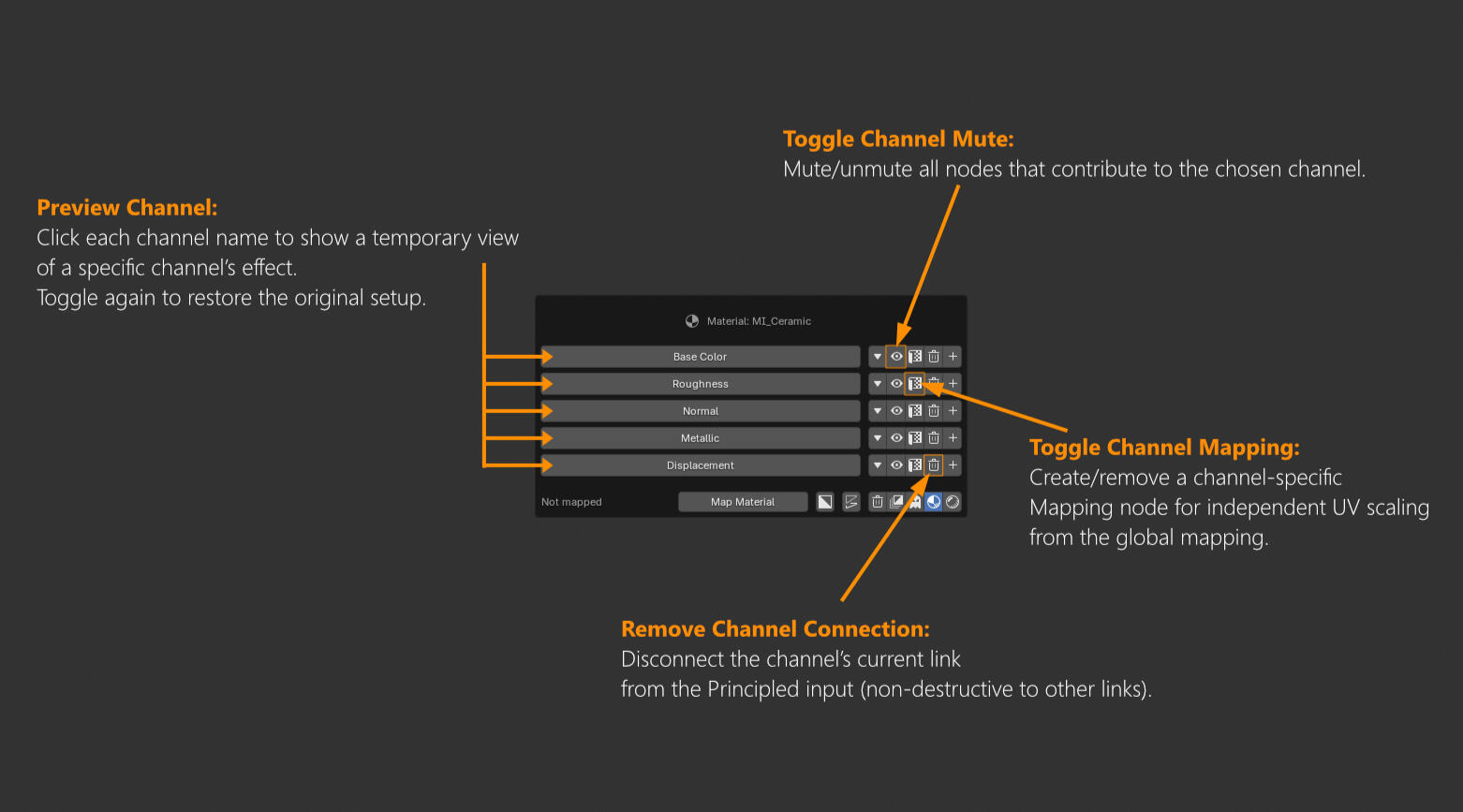 Mat Inspector Pro supports ALL Principled BSDF channels:Base Color, Roughness, Normal, Metallic, Transmission Weight, Emission Strength, Emission Color, Subsurface Weight, Alpha, Specular IOR, Coat Weight, Coat Roughness, Coat Tint, Sheen Weight, Sheen Roughness, Thin Film Thickness, DisplacementPreview Channel: Click each channel name to show a temporary view of a specific channel’s effect. Toggle again to restore the original setup.Toggle Channel Mute: Mute/unmute all nodes that contribute to the chosen channel.Toggle Channel Mapping: Create/remove a channel-specific Mapping node for independent UV scaling from the global mapping.Remove Channel Connection: Disconnect the channel’s current link from the Principled input (non-destructive to other links).