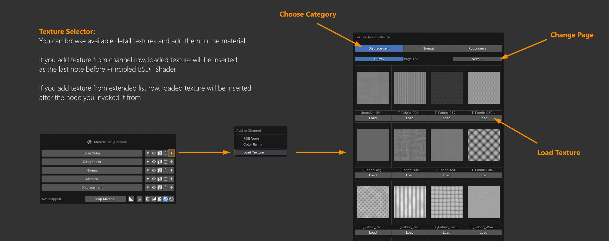 Texture Selector: You can browse available detail textures and add them to the material.If you add texture from channel row, loaded texture will be inserted