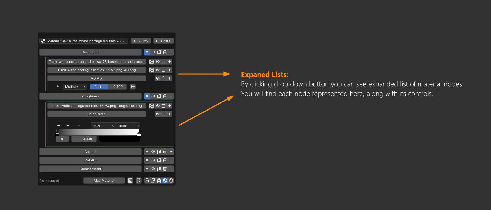 Expaned Lists: By clicking drop down button you can see expanded list of material nodes.